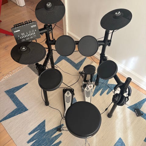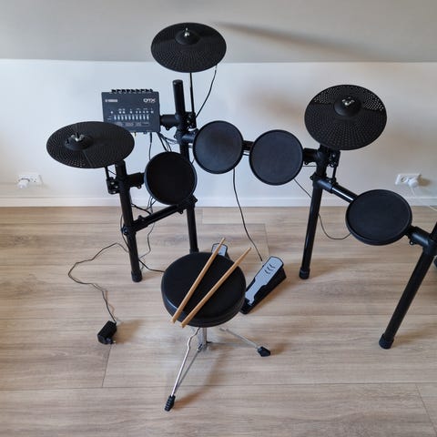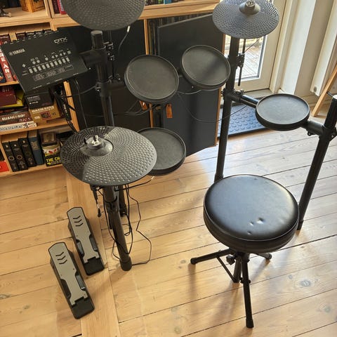 Yamaha DTX430K elektronisk trommesæt i sort. Sættet består af flere trommepads, bækkenpads, hi-hat med pedal, stortrommepedal, trommemodul samt stativramme. Trommemodulet har forskellige forudindstillede trommesæt og indstillingsmuligheder. Der medfølger manualer til DTX400K, DTX430K og DTX450K samt tilbehørsvejledninger. Velegnet til øvning i hjemmet eller i øvelokale, hvor der er behov for elektronisk trommesæt med justerbar lydstyrke.