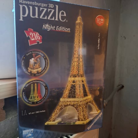 Ravensburger 3D Eiffel Tower puslespil med 216 plastbrikker. Motivet er Eiffeltårnet i Paris (La Tour Eiffel). Puslespillet samles som en tredimensionel model uden brug af lim. Anbefalet alder er 12-99 år. Velegnet som byggeaktivitet og som dekorativ model, når det er samlet.