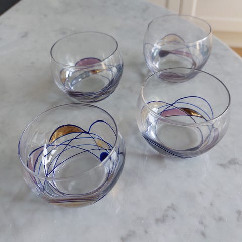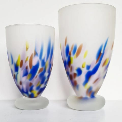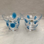 3 små glas designet af Lin Utzon for Rosendahl. Fra serien Confetti med blå og lime grønne pletter. Kan bruges som små vaser eller til fyrfadslys. I fin stand.