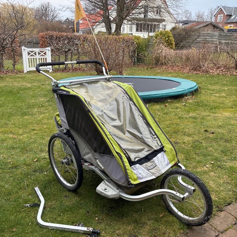 Thule cykelanhænger med plads til to børn med individuelle 5-punkts seler. Foran er der monteret et drejeligt forhjul, så anhængeren også kan bruges som klapvogn/jogger. Der er gennemsigtigt frontdække samt sidevinduer og reflekser på hjulene. Anhængeren har stort håndtag bagtil og opbevaringsrum bag på. Velegnet til transport af børn efter cykel eller som barnevognslignende vogn til gåture.