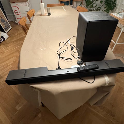 TCL soundbar i sort stofdesign. Lang, slank model velegnet til placering foran tv eller vægmontering. Tilsluttes med medfølgende strømkabel. Stoffet på enderne og bagsiden er lidt hullet men det er rent kosmetisk, og intet man ser dag til dag. Spiller som den skal.