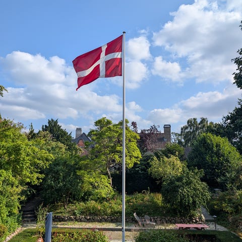 Glasfiber flagstang på 8 meter med vippebeslag, og sokkel samt Dannebrog flag.