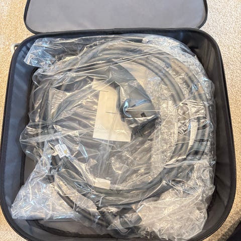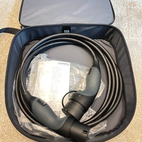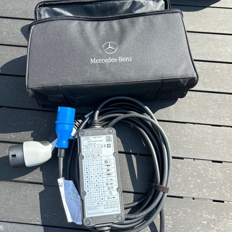 22 kW, Mercedes-Benz Home Charger væglader til elbil. Enheden er vægmonteret og udført i sort kabinet med integreret ladekabel. Fronten har Mercedes-Benz logo, og indersiden har statusindikatorer og nøglelås til aktivering. På bagsiden findes typeskilt med model- og godkendelsesoplysninger. Velegnet som fast ladeboks til opladning af Mercedes-Benz og andre kompatible elbiler i hjemmet eller i private parkeringsområder, forudsat korrekt installation af autoriseret installatør.