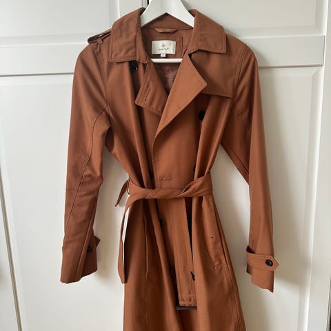 ONLY frakke til kvinder i str. S. Frakken er beige og fremstillet i polyester. Modellen er knælang med bindebælte i taljen og dobbeltradet lukning med knapper foran. Ærmerne har stropdetaljer ved manchetterne. Velegnet som overgangsjakke eller let yderjakke. På billederne ses enkelte mærker/slid på stoffet, som bør tages i betragtning ved køb.