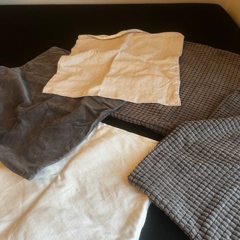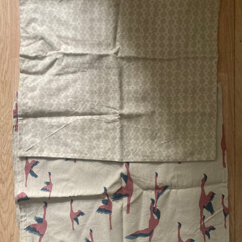 To IKEA pudebetræk 50x50 cm. i stof med grafisk mønster i grønne, gule og blå nuancer på hvid baggrund. Pudebetrækket har lynlås i siden, så det er nemt at tage af og på. Egnet til brug i stue, soveværelse eller andre rum, hvor der ønskes et farvet og grafisk indslag i indretningen. Prisen 30 kr. per styk.