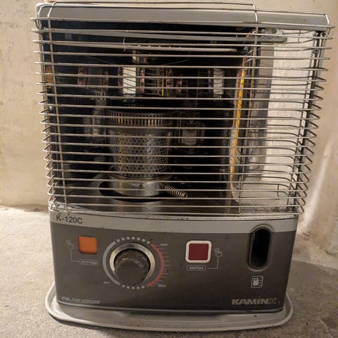 Ovnen har kabinet i gråmalet metal med frontlåge, hvor brænderen og tanken kan tilgås. Øverst er der ventilationsriller til varmeafgivelse.