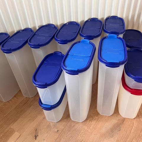 Tupperware opbevaringsbokse med blåt låg: