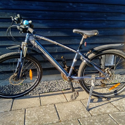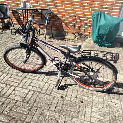 Velkørende sco drengecykel med 7 gear. Den har nogle skrammer på stillet som kan ses på billedet, hvis der zoomes ind. Passer til drenge på 8-12 år.