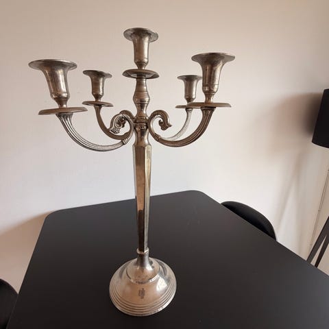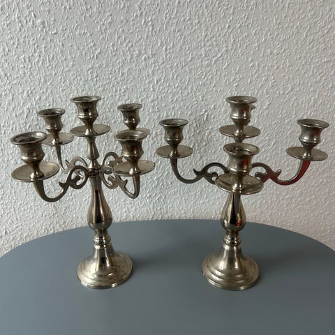Lysestager består af to femarmede lysestager med rund fod og klassisk formgivning. Hver lysestage har plads til fem stearinlys. Overfladen fremstår i mørk metalfinish. Velegnet som borddekoration eller til placering på hylde eller skænk i stue, spisestue eller entré.
