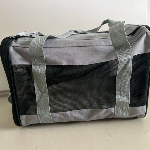 Transporttaske til kæledyr i grå tekstil med sorte detaljer og netvinduer på sider og top. Tasken har lynlåsåbning foroven og i siden, så dyret kan tages nemt ind og ud, samt bærestropper i siderne. Indvendigt er der plads til mindre kæledyr som fx hund eller kat, og bunden kan dækkes med tæppe eller pude for øget komfort. Tasken egner sig til transport på korte ture, besøg hos dyrlæge eller lignende situationer, hvor dyret skal med på farten.