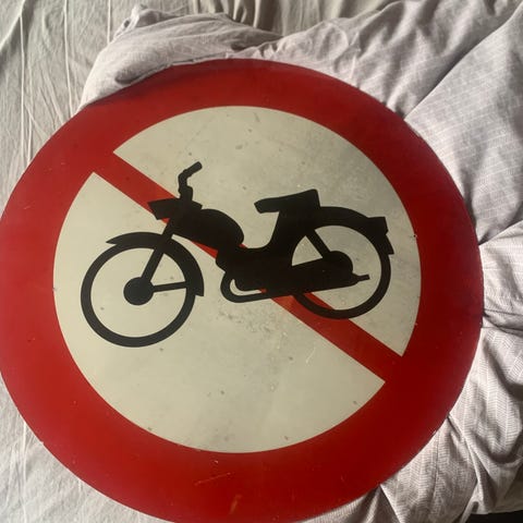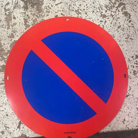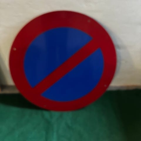 Rund færdselstavle med parkeringsforbud-symbol. Skiltet er i klassisk rød og blå farve med krydsmønster. Bagsiden er ensfarvet og uden tryk. Egnet til brug som vejskilt, dekoration eller rekvisit, afhængigt af stand og behov. Materiale fremstår som hård plade, egnet til udendørs eller indendørs montering efter eget valg.metal 50 cm i diameter