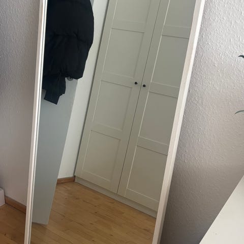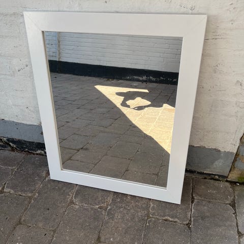 Jysk spejl med rektangulær form og hvid, profileret ramme. Spejlet er velegnet til brug i entré, soveværelse eller gang, hvor der er behov for et helkropsspejl. Kan placeres op ad væg eller monteres efter eget ønske, afhængigt af ophængsløsning.