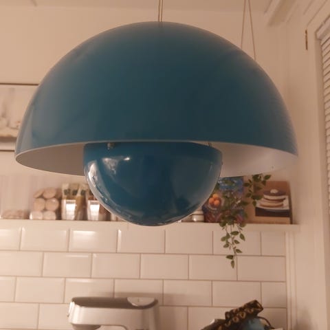 Gubi Panton pendel designet af Verner Panton. Loftlampen er udført i hvidt materiale med en stor halvkugleformet skærm og indvendig kugleformet diffuser, som giver et nedadrettet og blændfrit lys. Egnet over spisebord, i stue eller andre opholdsrum, hvor der ønskes et centralt loftlys. Nypris kr. 3000. Ca. 1 år gammel