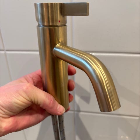 Sælger denne vandhane, da jeg synes, den blev for stor til min håndvask. Den er så god som ny, og fungerer upåklageligt. Den har kun ganske få ridser på toppen (alm. brugsspor), som kun ses, hvis du går helt tæt på i den rigtige belysning. Batterier medfølger.