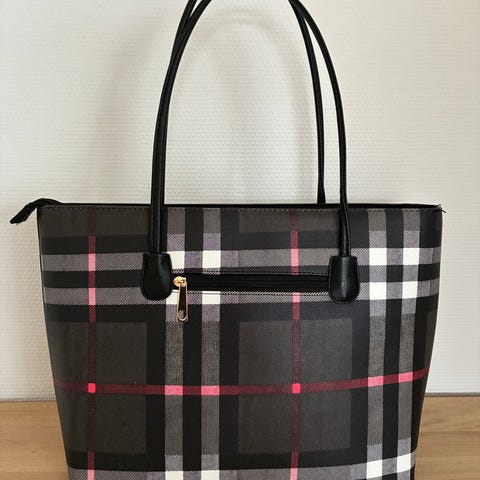 Taske i shopper-model med stribet mønster i blå og beige. Tasken har to faste læderhanke og forstærkede læderhjørner i bunden. Indvendigt er der lyst foer og snørelukning øverst, som kan trækkes sammen for at holde indholdet på plads. Velegnet som hverdagstaske, strandtaske eller indkøbstaske.
