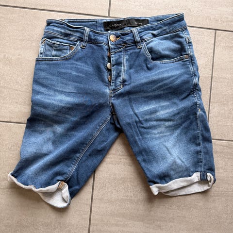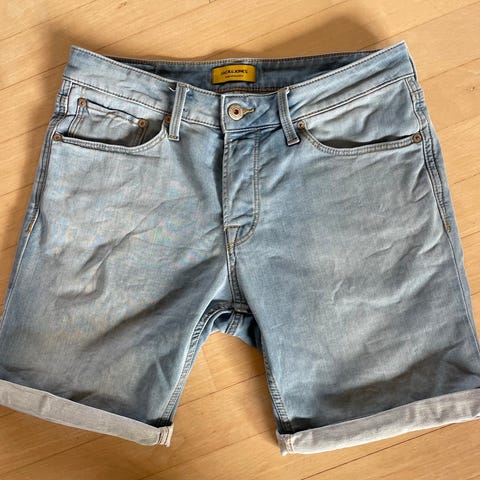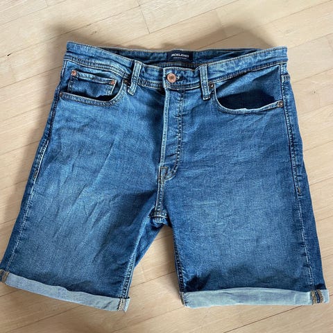 Jack & Jones shorts til herre i blå denim-look. Størrelse M med regular pasform. Fremstillet i bomuld med klassisk femlommers-design, bæltestropper med knap og lynlås. Oplægget benkant, som kan foldes efter behov. Velegnet til hverdagsbrug.