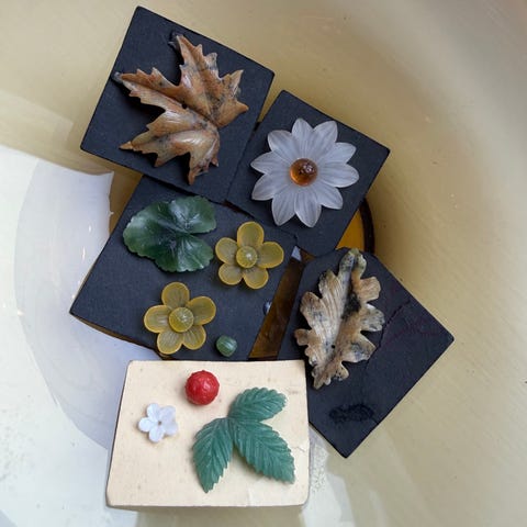 1) blomster i sart grøn/rosa med to hvide perler - en i hver blomst. Købt hos Tenerife Pearls (kendt for deres ferskvandsperler).