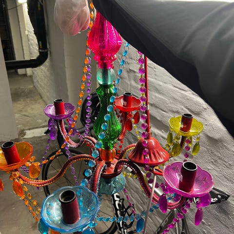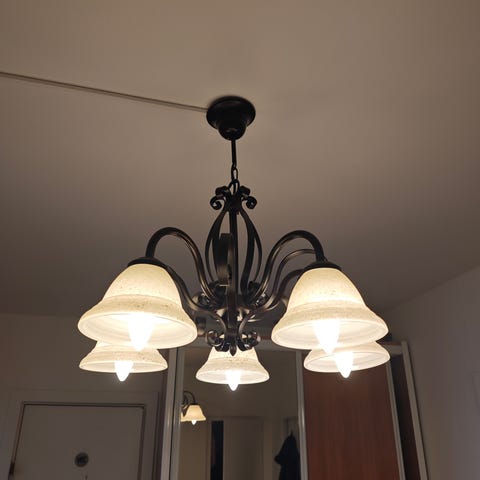 Lille lysekrone i krom med 3 lyskilder. Lampen giver et rigtig fint lys, har været brugt i en gang.