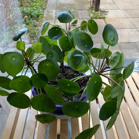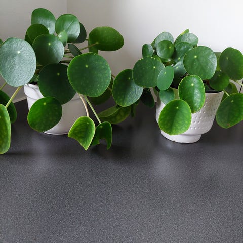 Pilea peperomioides plante stiklinger i potte med grønne, runde blade.