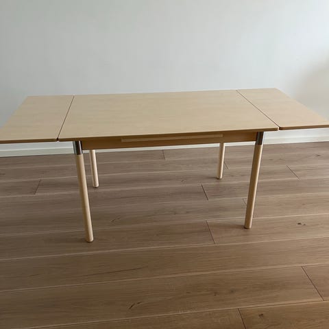 Spisebord i bøg med udtræk samt 5 stole med stof betræk. Fin stand.