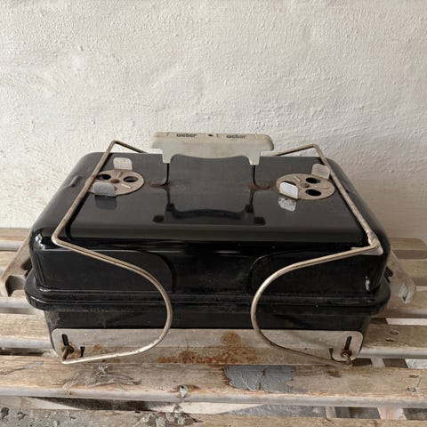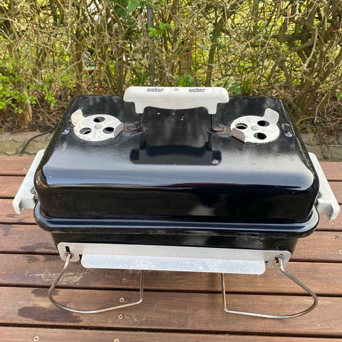 Weber bærbar kulgrill i rektangulær form og sort farve. Grillen har låg med justerbare luftspjæld og bærehåndtag samt sammenklappelige ben, der fungerer som understel under brug. Velegnet til kulgrillning på farten, f.eks. til picnic, strand eller mindre udendørsarealer.