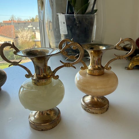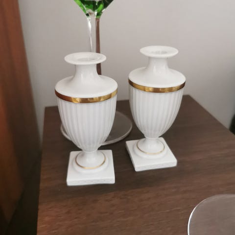 Lampeskærmene er udført i frostet hvidt glas med bølget kant og mønstret overflade. Øverste del har messingfarvet fatning og ophæng. Egner sig til montering på loftslampe eller væglampe, hvor der ønskes skærme i glas med klassisk udtryk.