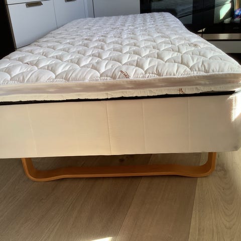Den ene er fra jysk med 19 cm. ben (se særskilt billede) med tilhørende topmadras med kerne af åndbar latex.