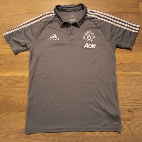 Adidas Manchester United sweatshirt i grå i størrelse M. Trøjen har rund hals og lange ærmer samt de karakteristiske Adidas-striber på skuldrene. På brystet er der broderet Manchester United-klublogo, Adidas-logo og AON-logo. Fremstillet i blødt sweatshirt-materiale, egnet som fritids- eller træningstrøje.