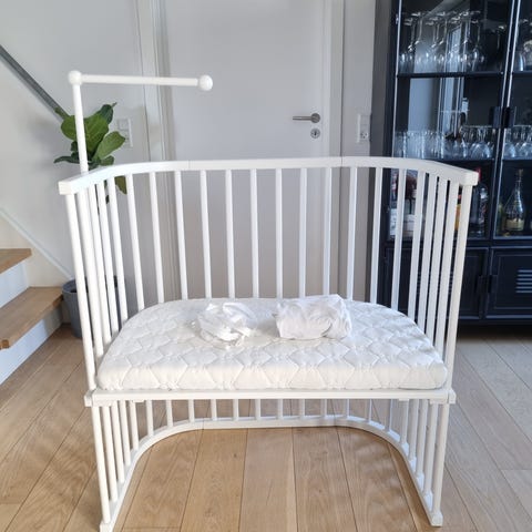 Babybay bedside crib i klassisk design. Sengen er beregnet til spædbørn (vi brugte den til hun var 10 måneder) og kan placeres ved siden af forældrenes seng, så barnet ligger tæt på. Tremmesengen har afrundede hjørner og åbning mod siden, så den kan bruges som bedside crib. Velegnet til brug som babyseng i soveværelse.