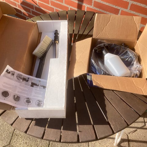 Nyt fliserensesæt med teleskopskaft til rengøring af fliser og terrasser. Sættet består af en bred børste til fjernelse af mos og alger fra fliser og træterrasser samt en smal børste med indbygget skraber til rengøring i fuger og samlinger. Teleskopskaftet kan justeres i længden, så arbejdet kan udføres stående. Sættet er egnet til udendørs brug på forskellige belægninger.