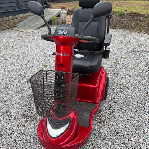 El scooter ladeløbehjul i gul farve med stort frontbagagebærer og bagboks. Scooteren er udstyret med elektrisk motor og oplader, som ses tilsluttet på billederne. Der er solid saddel, fodplade og spejle. Bagpå er monteret ekstra opbevaringskasser og holder, som kan bruges til transport af mindre gods eller pakker. Egnet til kørsel på vej og cykelsti efter gældende regler for el-scootere.