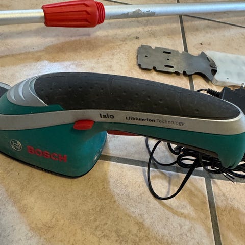 Bosch Isio hækkesaks og græssaks sæt. Batteridrevet multiklipper til havearbejde med udskiftelige klinger til mindre hække, buske og græskanter. Sættet omfatter håndenhed, forskellige skær, oplader og opbevaringskasse, som vist på billederne. Velegnet til præcisionsklipning i haven og mindre beskæringsopgaver.