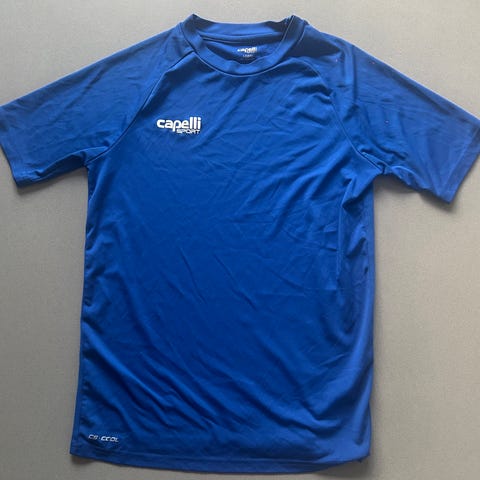 RSL badminton t-shirt til mænd i størrelse S. Kortærmet sportstrøje i blå farve med rund hals. Fremstillet i let, åndbart materiale egnet til sport og træning. Tryk med RSL-logo foran og "RSL Sommercamp 2025" på ryggen.