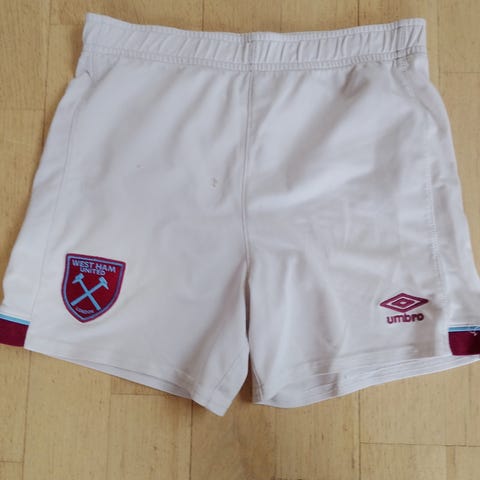 Umbro West Ham United fodboldtrøje i størrelse L. Trøjen er bordeaux med lyseblå detaljer ved hals og ærmekanter samt mønster på skuldrene. På fronten ses klublogo, Umbro-logo og sponsortryk, og på det ene ærme er der yderligere sponsortryk. Egnet til fodbold og anden sport eller som supportertrøje. Modellen er designet til kvinder i størrelse L.