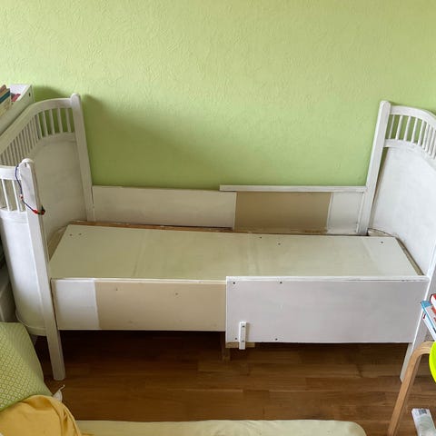 Orginal Juno tremmeseng i hvid. Sengen ses både samlet og adskilt på billederne. Klassisk tremmekonstruktion med lamelbunde og høje gavle. Egnet som seng til baby og mindre barn. Materiale er lakeret træ. Kan bruges som sovemøbel på børneværelset eller som ekstra seng andre steder i hjemmet.