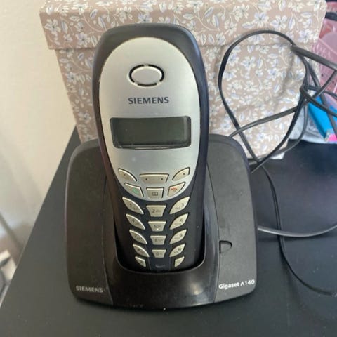 Fastnet telefon med holder, oplader og telefon kabel sælges