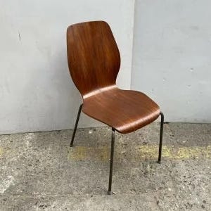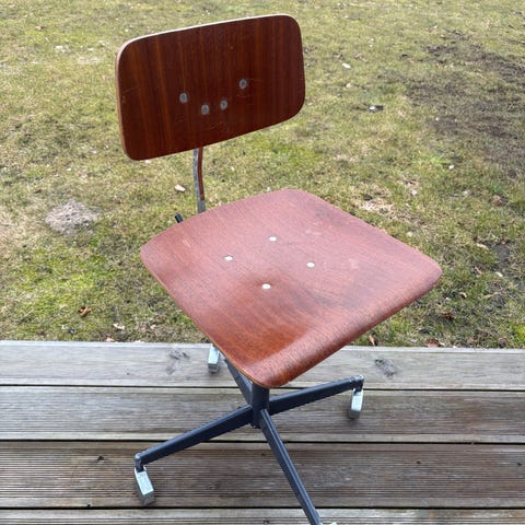 Kontorstol/Skrivebordsstol/Skalstol af formspændt teaktræ med sorte stålben.