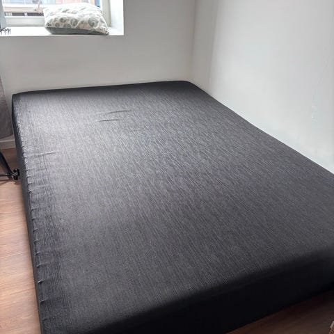 IKEA seng uden ben i let stofbetrukket stel og træben. Velegnet til brug med en madras i samme størrelse. Enkel, rektangulær sengekonstruktion med polstret sidestel og flade overflader, der giver stabil støtte til madrassen. Neutral, lys farve. Skal afhentes i Aarhus