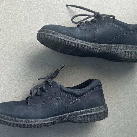 Ecco snøresko i læder, str. 41. Modellen er en klassisk sort sko med snørelukning og kraftig gummisål med mønster for bedre fodfæste. Overdelen er i glat sort læder, og indvendigt er der lys indersål. Skoene egner sig til hverdagsbrug og kan bruges både til pænt og mere afslappet tøj.