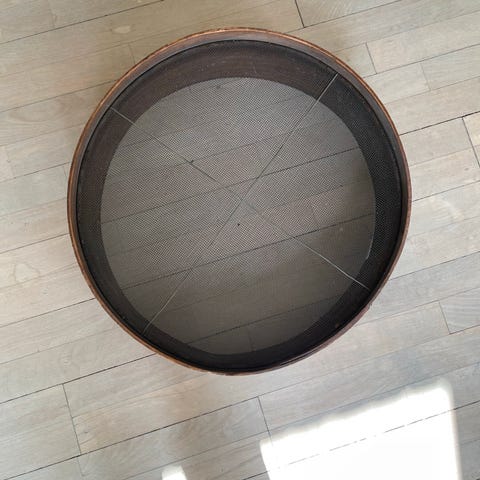 sigte i rund form. Rammen fremstår i træ med net i midten. Egnet som dekorationsgenstand eller til brug, hvor en grov sigtning er ønsket, afhængigt af stand og behov.