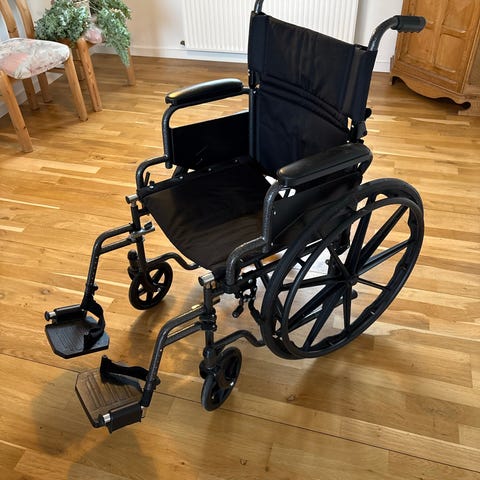 Zt Mobil kørestol i sort med polstret sæde og ryglæn. Kørestolen har store baghjul med håndfælge, mindre forhjul og aftagelige fodstøtter. Armlænene er faste og polstrede. Bagpå er der skubbehåndtag og opbevaringsnet. Velegnet til indendørs og udendørs brug, hvor der er behov for manuel kørestol med god støtte og komfort.