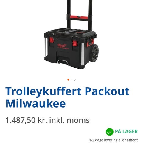 Milwaukee Trolley. Kassen har teleskophåndtag og store hjul, som gør den egnet til transport af værktøj og tilbehør. Indvendigt er der et rummeligt hovedrum med indsats og skillevægge til organisering af indholdet.