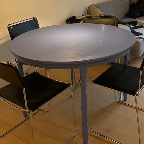 Rundt hvidt spisebord, enkelt og let bord hvidmalet, der er nogle krakeleringer i malingen på overfladen af bordet, der kan slibes ned og males som man ønsker det.