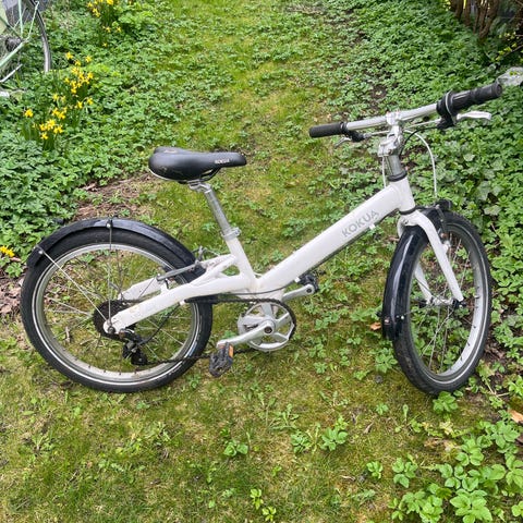 Børnecykel med 16" hjul i hvid farve. Cyklen har lav indstigning, kurv bagpå, støtteben, skærme og bagagebærer. Velegnet til større børn, der har brug for en praktisk hverdagscykel til skole og fritid.
