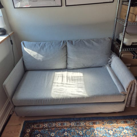 Sød, sin lille sovesofa. Udslået ligge mål 200 cm. Sidde højde 36 cm. Der er igen brugsspor, men en lille plet.