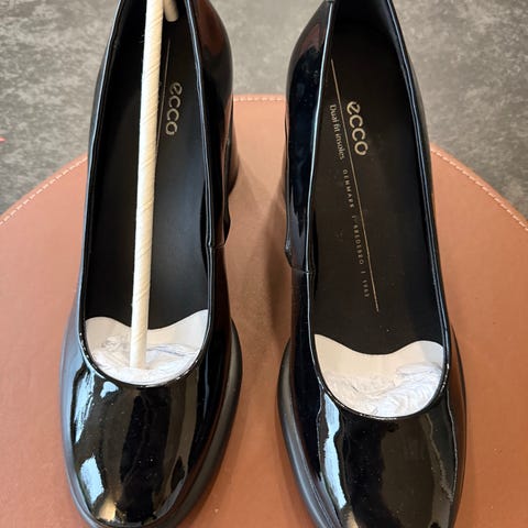 Ecco festsko til dame i størrelse 37. Skoene er sorte med spids snude og blokhæl. Overdelen er i glat materiale med krydsdetalje foran. Ydersålen har mønster for bedre fodfæste. Velegnet som pæne sko til fest og andre formelle anledninger.