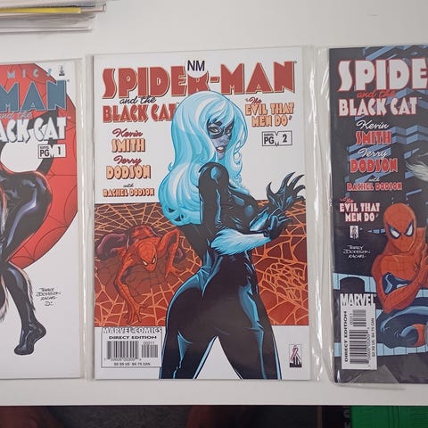 Marvel Spider-Man tegneserier sæt. Sættet består af flere hæfter med Spider-Man og andre Marvel-figurer på forsiderne. Tegneserierne er i farver og ligger i plastlommer. Egnede til samlere af Marvel- og Spider-Man-tegneserier.