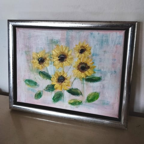 Maleri med motiv af solsikker i vase, indrammet i profileret træramme med gylden finish. Rektangulært format, lodret ophæng. Signatur ses nederst på motivet. Velegnet som vægdekoration i stue, gang eller andre opholdsrum.