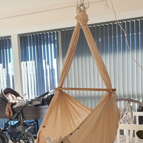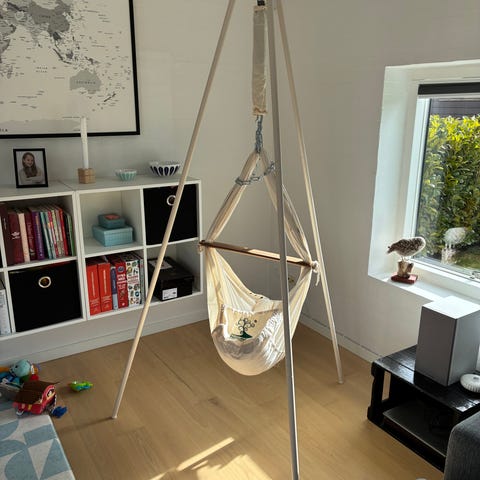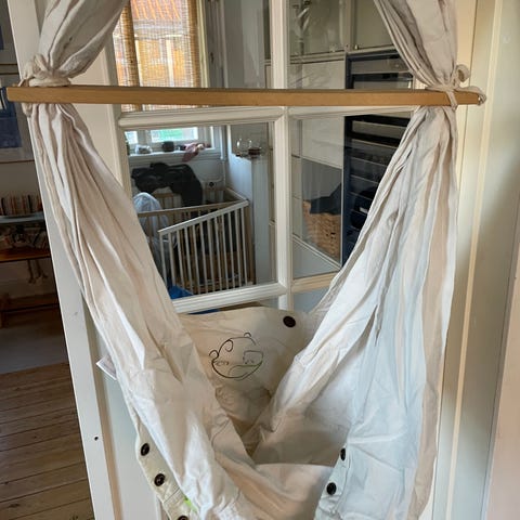 Slyngevugge fra Nonomo i grå og motor fra Moonboon (se billede for model). Begge dele købt fra ny i december 2025 og brugt i få måneder til 1 barn. Der medfølger karmbeslag. Vi har haft vuggen hængende i loftet i den medfølgende strop.