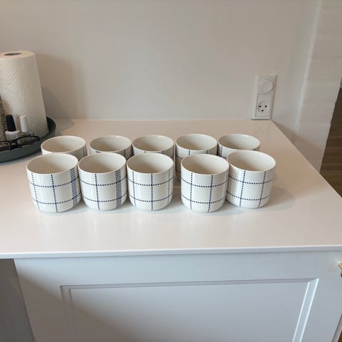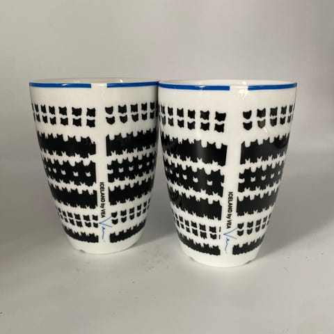 Normann Copenhagen krus i hvidt porcelæn med blåt mønster. 2 stk